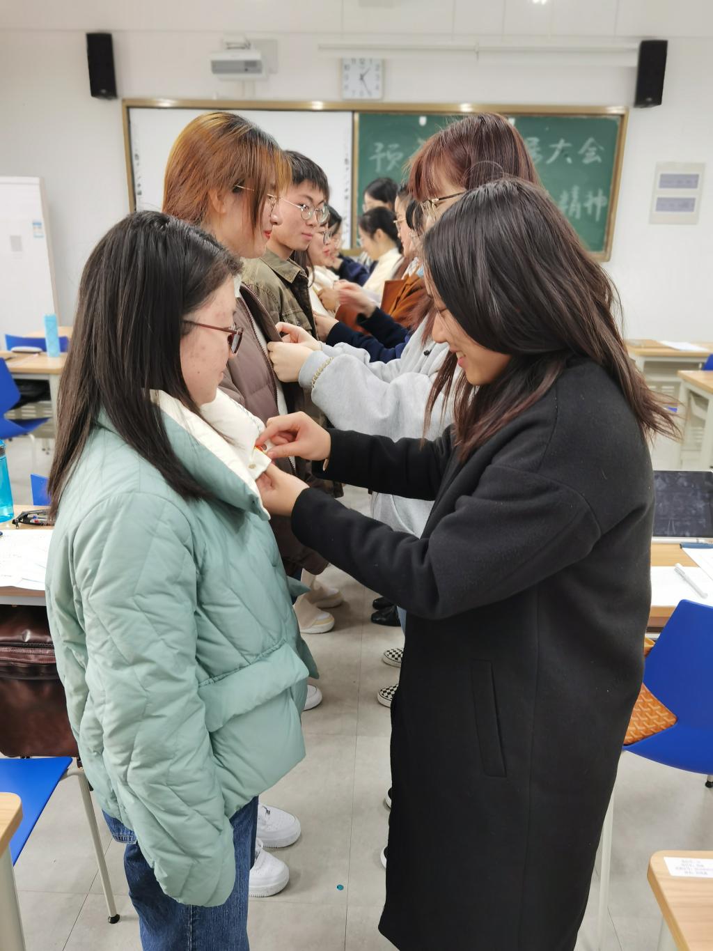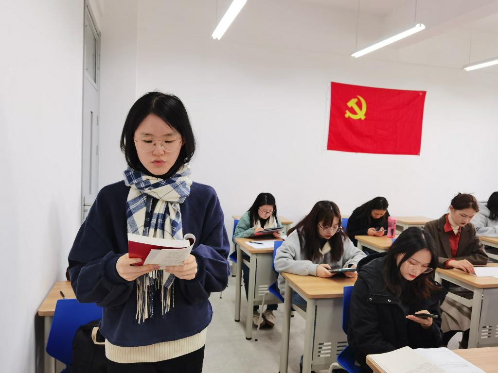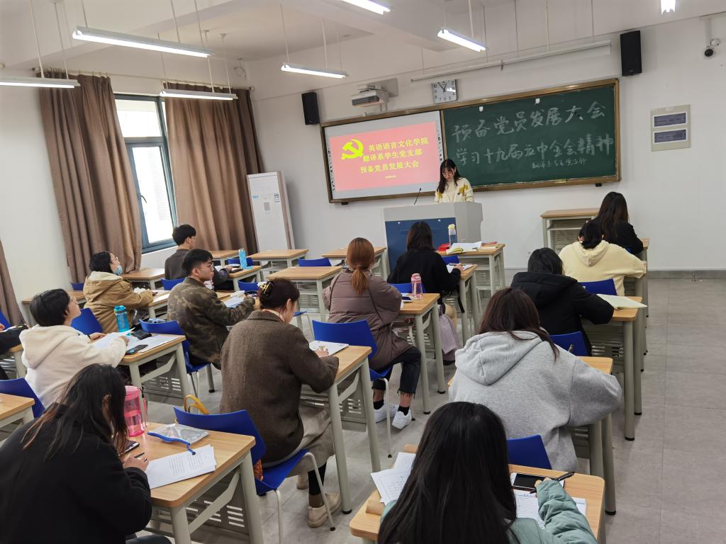 专题党课后,翻译系员工党支部召开预备党员接收大会。党支部全体成员起立,奏唱国歌。在奏唱完庄严的国歌后,会议进入第二部分,吸收7名发展对象为预备党员。大会上7名发展对象依次上台讲解自己入党的心路历程,宣读入党志愿书,介绍人宣读介绍人意见,党支部书记宣读政治审查综合报告并提请支部大会讨论,然后党支部书记主持大会讨论并组织全体正式党员投票表决,接着党支部书记宣读支部大会决议,一致同意7名同志接收为预备党员。在入党表态中,范程慧同志说:“在这一年里感谢党组织及各位党员同志对我一直以来的关心、支持、帮助和教育,让我提高了对党的认识,热爱党,坚定的做一名共产主义者。”沈斌艳同志表示,“很激动今天能成为预备党员,今后我会继续认真学习,贯彻党的十九届五中全会精神,努力提高为人民服务的本领,让自己更加坚定的立足本身,使自己成为一名合格的共产党员”。其后,全体师生党员宣读入党誓词,并佩戴党员徽章。
