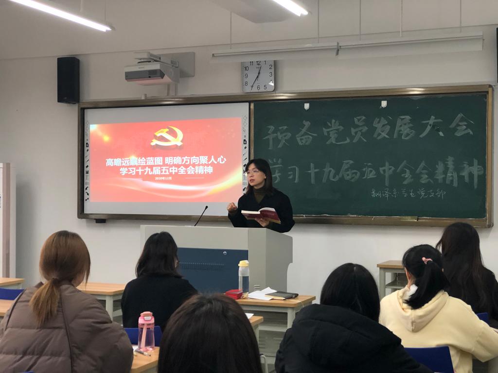 会议伊始,支部书记陶诚为全体党员上了一节生动的党课。支部书记以“高瞻远瞩绘蓝图 明确方向聚人心”为主题,详细深入地阐述了十九届五中全会精神的内涵,并结合翻译系实际,对全体员工党员提出几点要求:一是要充分认识党的十九届五中全会的全局性历史性意义;二是要深刻领会决胜全面建成小康社会取得的决定性成就;三是要正确认识和把握我国发展环境面临的深刻复杂变化;四是要全面把握“十四五”主要目标和到2035年远景目标;五是要学会担当,在新征程中贡献自己的青春力量。
