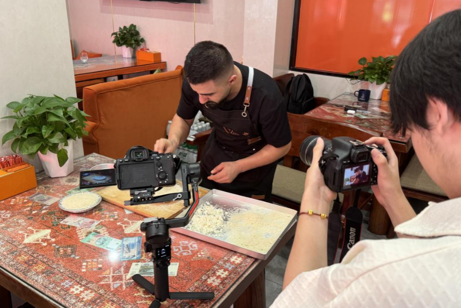 现场,巴勒什用翻译器确认“减糖”需求,指尖翻飞制作“库纳法”:酥皮经火淬炼,淋上红糖与白砂糖调和的糖浆,撒上开心果碎,一份适配中国口味的甜品即成。成员们了解到,阿布杜拉与巴勒什每日收集意见,根据反馈调整糖分,还用红糖替代部分白砂糖融合中东风情。成员比划“HongTang”,巴勒什立刻竖拇指,以手势示意红糖已经添加在甜品之中——语言不通,舌尖共鸣早已跨国界。