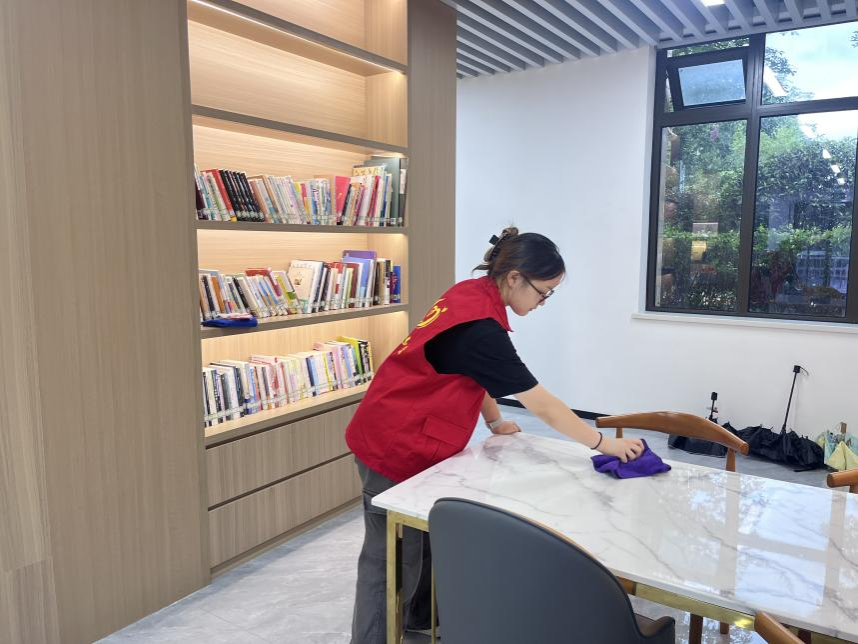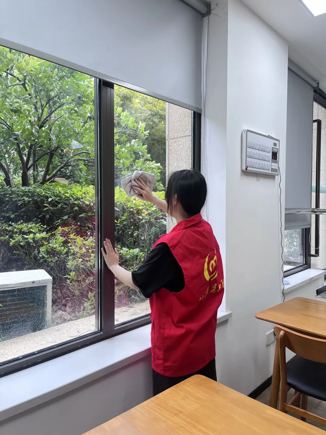实践团脚步不止于图书馆,更延伸至社区养老院的各个角落。队员们定期携带清洁工具前往,细致擦拭门窗玻璃、桌椅扶手,认真清扫公共活动区域,彻底清除卫生死角;同时整理爱心伞、维护基础设施,用实实在在的劳动改善长者居住环境,让暖心关怀体现在每一处细节里。