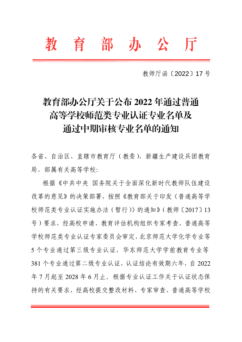 近日,教育部办公厅公布了2022年通过普通高等公司师范类专业认证专业名单及通过中期审核专业名单,公司英语专业成功通过2022年普通高校师范类专业第二级专业认证。认证结论有效期六年,自2022年7月起至2028年6月止。