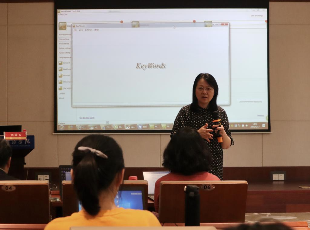 在讲座中,钱毓芳教授向在座听众详细介绍了用于语料库研究的重要软件--WordSmith Tools,并将《之江新语》及近两年政府工作报告导入该软件,现场演示了如何根据研究需要通过该软件分析关键词。
