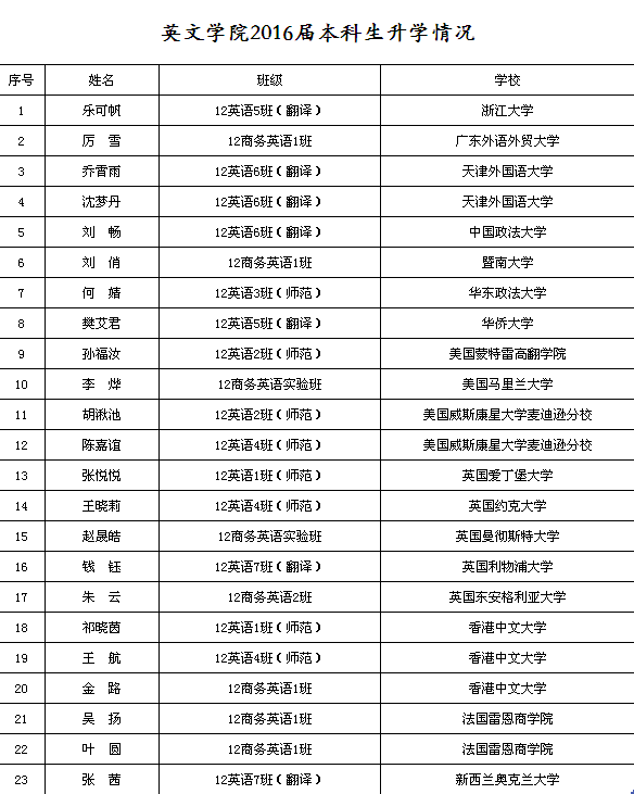 EMC易倍2016届本科生升学情况再创佳绩。截至目前,共有23名同学被国内外知名院校录取,升学率达9%。其中,8名员工被浙江大学、暨南大学、中国政法大学、广东外语外贸大学、天津外国语大学等大学录取。15名员工被美国蒙特雷高翻公司、马里兰大学、爱丁堡大学、香港中文大学等高校录取。