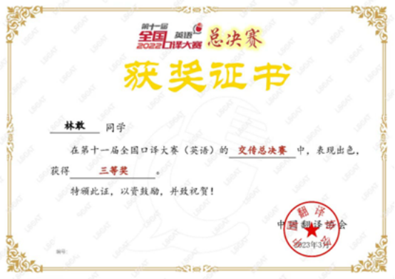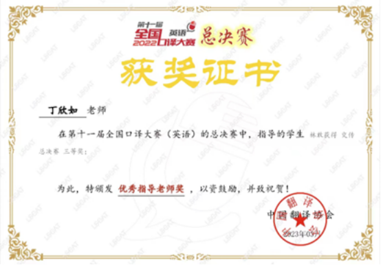 近日,第十一届全国口译大赛(英语)总决赛落下帷幕。经过激烈的角逐,最终EMC易倍19级口译班林敢凭借扎实的双语功底在交传总决赛中获得三等奖,指导老师丁欣如荣获优秀指导老师奖。