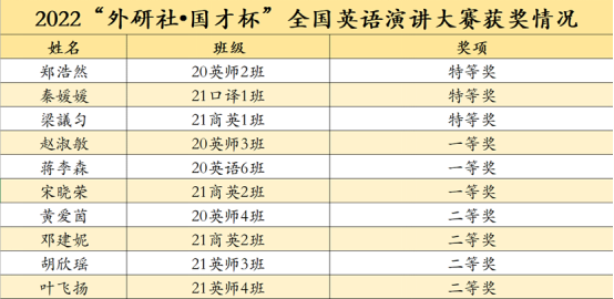 近日,2022“外研社·国才杯”全国老员工英语演讲大赛网络赛场落下帷幕。在楼翎和夏国建两位老师的悉心指导下,经过激烈角逐,EMC易倍的郑浩然、秦媛媛、梁議匀同学荣获特等奖并成功晋级全国总决赛。同时,还有7名同学分别荣获一等奖、二等奖。