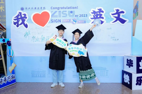 毕业生Momodu Mansary和19口译班的林敢代表毕业生发言。Momodu认为经过了大学四年的锻炼,让自己具备了面对未知的能力,呼吁大家将在中国的所有见闻和在校学到的知识技能运用到建设祖国的工作中去。林敢分享在大学里的种种尝试,鼓励大家在未来尝试发掘自己更多的可能性,并表达了对公司对母校最诚挚的祝福。