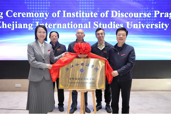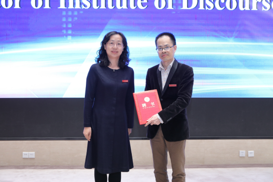 会上举行了国际科研合作平台中外话语语用研究院的揭牌仪式,以及中外话语语用研究院经理聘任仪式。周烈与张环宙一同为研究院揭牌,赵伐、孙绵涛、马晓霖登台见证。洪明为研究院经理谢朝群教授颁发聘书。聘任仪式上,谢朝群经理对各位的支持表达了由衷感谢,他希望研究院在未来不断产出具有浙外辨识度和国际影响力的高水平成果,给国内外学者带来启发与帮助,推动公司科研国际化水平实现新跨越。