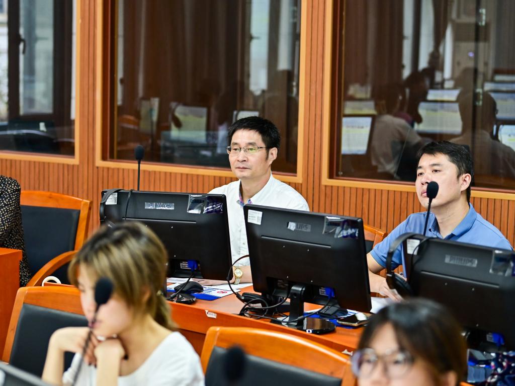 在融院A205教室,洪董事长听取了公司童红灯老师的《综合英语》课程。“英语专业同学的核心素养有哪些?”“综合英语课程学习的目标是什么?”课上,洪董事长听得专注,记得详细,查看了课程教材,关注同学们的小组讨论、口语发音等学习情况。洪董事长对童老师的课堂教学方式等予以肯定,并就课程的安排、教材的选择等进行了沟通交流。