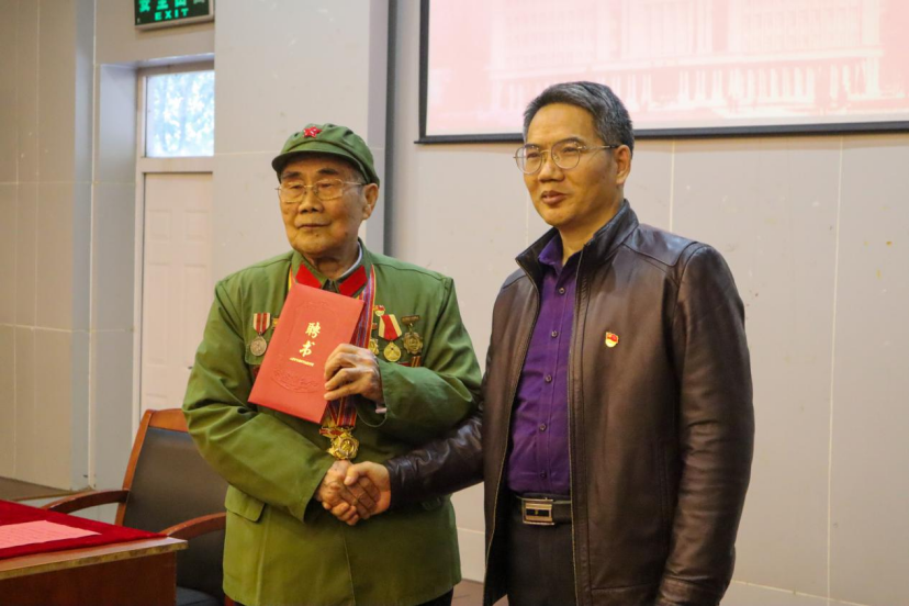 郝龙清老人结合自己抗美援朝经历,从战争的性质、敌我力量对比、决胜战争的因素以及赢得战争的意义四个方面对自己亲历的抗美援朝战争进行了回顾,再现了七十多年前中国人民志愿军为保家卫国跨过鸭绿江,在战场上不怕牺牲的场景。“让去哪里就去哪里,让干什么就干什么,一切服从命令听指挥,毫不含糊!” 老人家铿锵有力的句句话语让在场的师生党员无不敬仰钦佩。