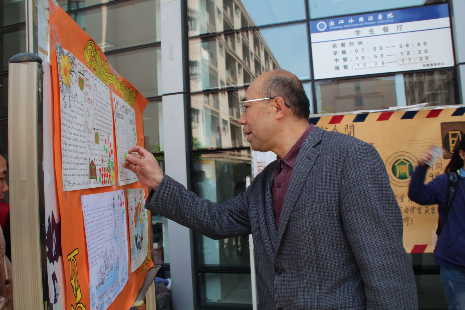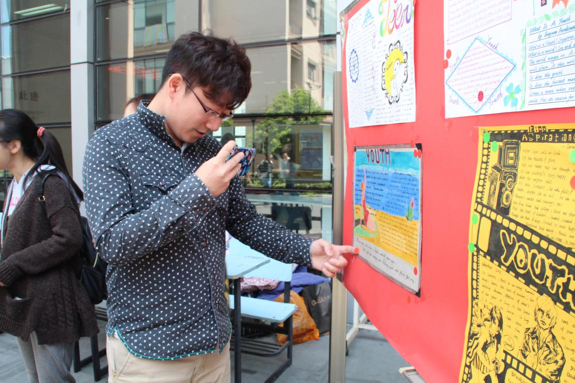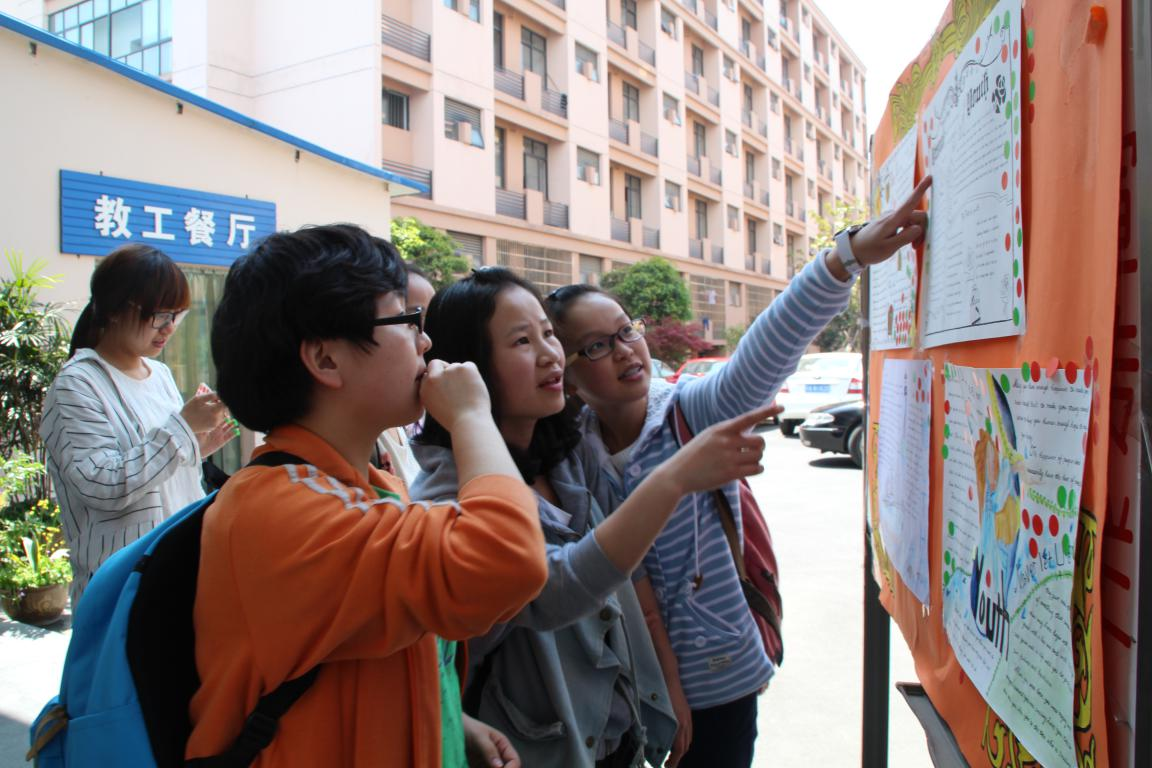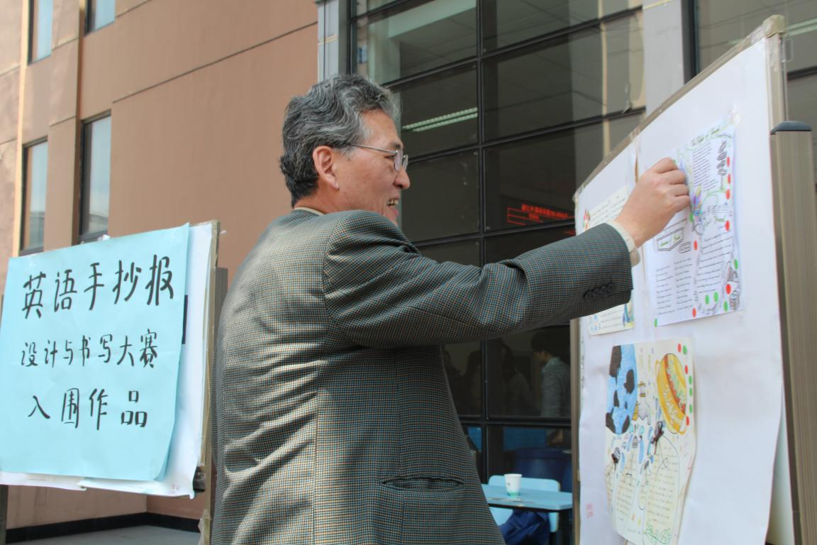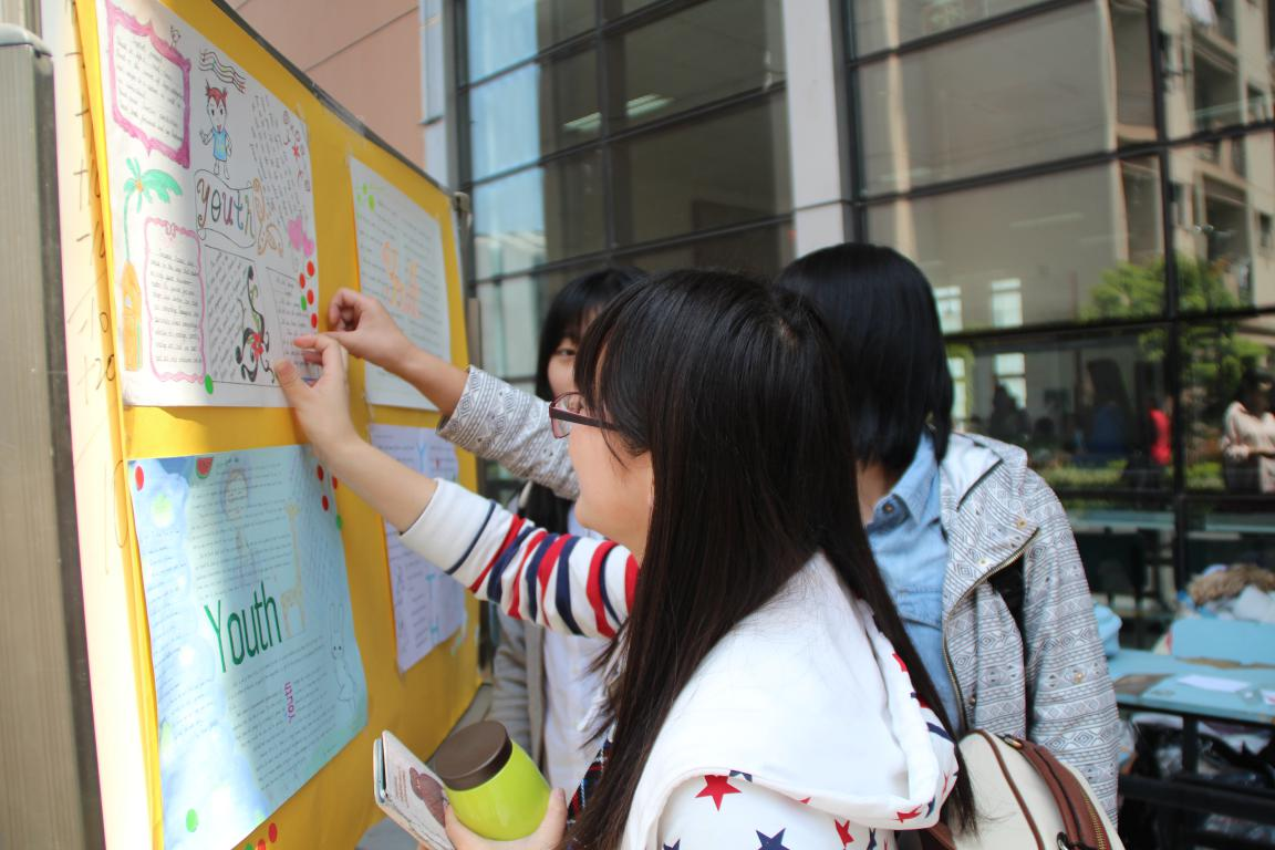 4月22日中午,第四届英语文化节系列活动之手抄报设计大赛在食堂门口进行现场投票。初赛的30多幅作品经过专业评审,最终14幅作品入围决赛。来往同学都被入围的手抄报独特的设计、精美的文字所吸引,驻足观赏,并争相从工作人员处领取贴纸,为自己心仪的手抄报投票点赞。
