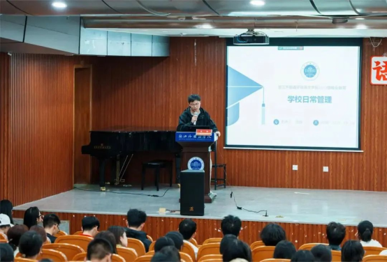 10月16日晚,EMC易倍新生始业教育第二讲在博文堂举行,教学副经理陶伟、辅导员吴小慧、张俊分模块向同学们进行介绍。