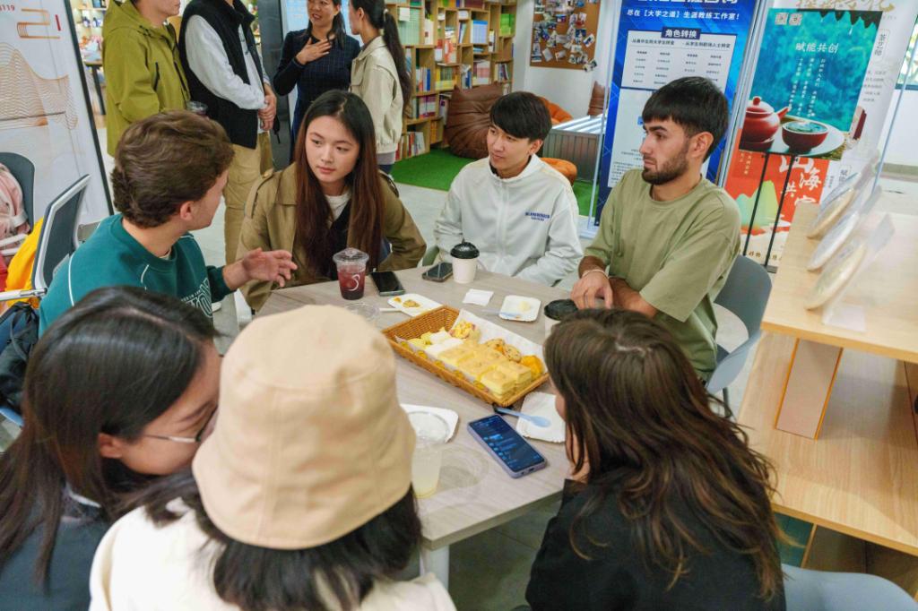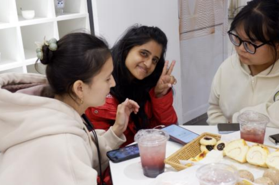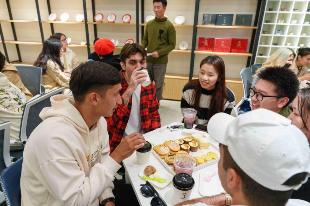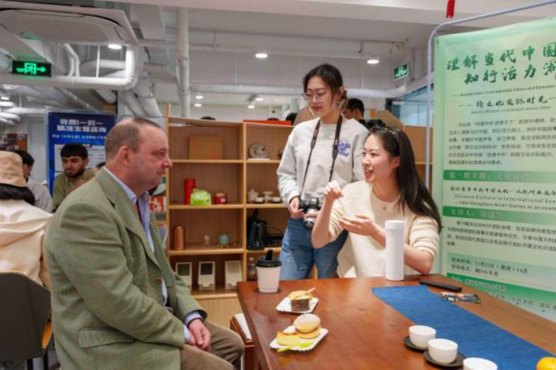 在场的师生们一边畅谈活动感悟,一边享受美味茶点。中文和英文相互交融,现场活动氛围活泼、热烈、和谐。双方不仅交到了新的朋友,了解了亚运盛会,也更好地交流了世界各地文化。