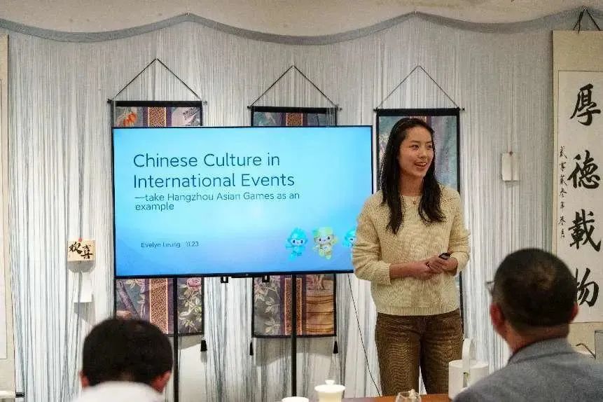 随后,EMC易倍21商务英语1班的梁議匀同学围绕文化自信主题,进行了题为《国际赛事中的中国文化——以杭州亚运会为例》的演讲。梁議匀向大家展示了亚运村里经典的中国元素,分享了她在亚运会志愿期间与运动员共度中秋、国庆佳节的难忘经历。中国传统节日的风俗习惯激起了大家的浓厚兴趣和热烈的讨论。