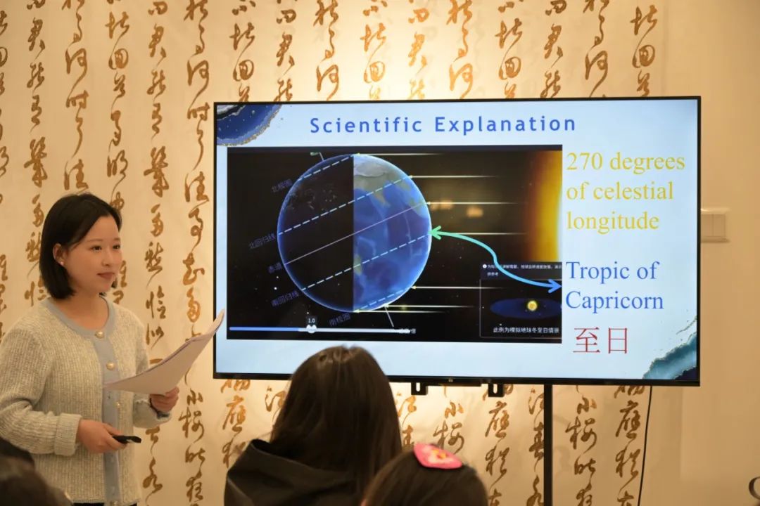 21商务英语1班的徐可心阐述了节气的起源和发展历程,帮助大家进一步感受古老的节气背后的丰富文化底蕴。她详细解读了各个节气所代表的意义,以及与之相关的传统习俗和民间故事,介绍在现代生活中传承和弘扬二十四节气文化的意义和路径。临近冬至,徐可心着重介绍了冬至的天文历法、气象变化、物候现象和传统习俗,还介绍了“北方吃饺子,南方吃汤圆”的习俗由来和象征意义,向国际职工展现了中国古人的独特智慧。