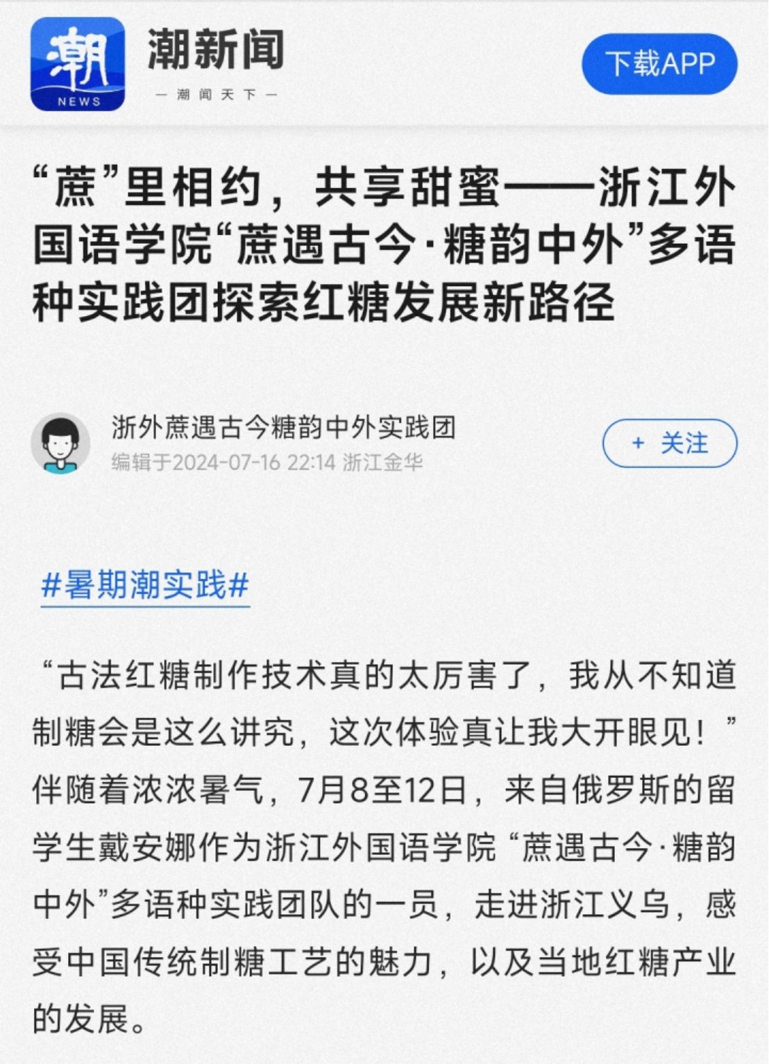 该团队以“红糖之乡”义乌市义亭镇和“中国红糖第⼀村”义亭镇⻄楼村为实践地点,积极响应“乡村振兴”和“千万⼯程”建设的号召,携⼿海外留学⽣探寻并借鉴义亭镇⻄楼村“数字化”红糖产业发展的致富法宝,期望以“先富带后富“的形式助力古亭塘村发挥当地的区位优势,开拓当地乡村振兴数字化国际化新路径,推动义乌红糖⾛出国⻔、⾛向国际。团队成员实践脚步从田间地头走到生产车间,不仅促进了文化的传承与创新、拓宽了文化传播的广度,为乡村振兴提供了多元化路径,也展现了青年学子的社会责任与担当。