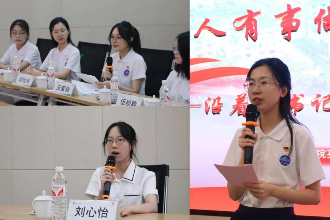 实践团队成员21英语(师范)3班胡欣瑶以“三树金星”的发展故事为脉络,给大家汇报了此次社会实践的成果和感悟,同时,她以党建引领和国际化传播角度分享了自己作为新时代青年的所思所想。22英语5班应紫依作为成员代表分享了心得体会。2024级英语(师范)专业、开化籍新生代表24英语(师范)4班刘心怡汇报了《习近平的七年知青岁月》读后感。
