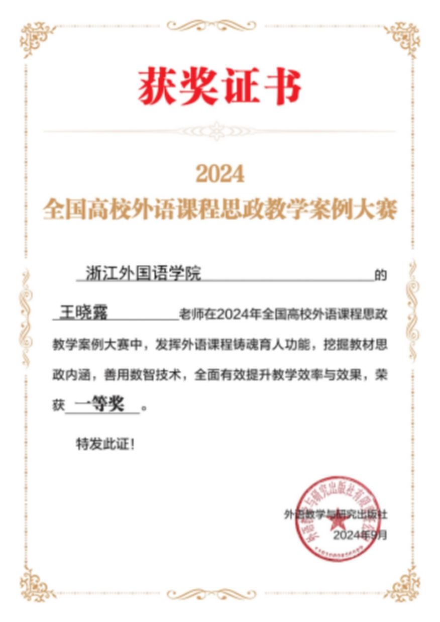 近日,2024年全国高校外语课程思政教学案例大赛落下帷幕。经过激烈角逐,EMC易倍教师王晓露荣获一等奖。王晓露老师本次参赛的课程是《口译基础》,展示的教学单元内容为口译的译前准备。该课程是公司首批“百门金课”、“三进”示范课程和知识图谱课程。