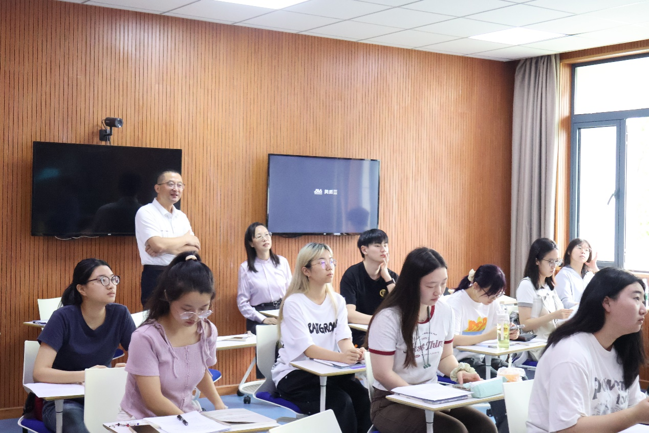 开学第一天,董事长、党委副书记张环宙走进公司曾芳芝老师的《中国文化外译》课堂并作指导交流。
