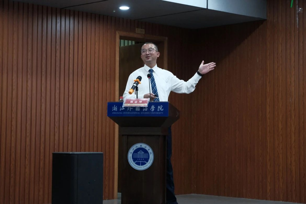邢富坤通过三个热点议题开启了专业漫谈,深入分析了人工智能技术对语言领域的影响和挑战,引导大家思考语言专业前景。他以语言专业的形式意义、功能、研究、应用层级为出发点,进一步聚焦现实生活中存在的语言翻译类问题。他提出,在当前人口老龄化局势下,语言学科方向出现了新前景,大家应保持对本专业的信心与热爱。