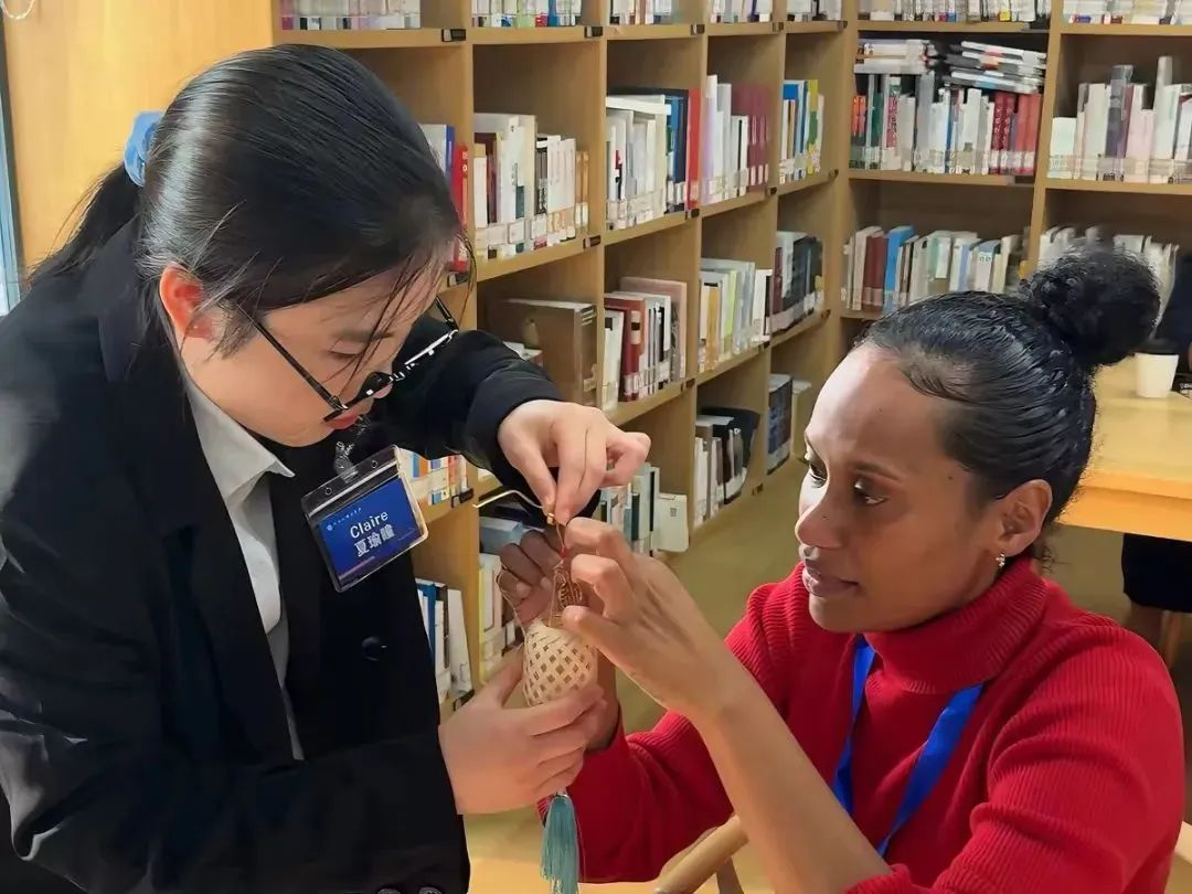 桂花灯,象征着光明和希望。在“折桂结贵缘”活动中,中国员工们邀请外交官员们一起亲手制作了精美的桂花灯,撑开竹篓、串上珠子、挂上流苏、粘上装饰,一盏盏精美小巧的桂花灯在外交官们手中点亮。来自斐济的外交官员Adi Aricta Tegei Latianara对这富有魅力的中国传统手工艺品十分感兴趣,“This little lantern is so beautiful, I like it very much, I will carry it all the time for everyone to see(这个小灯笼太精美了,我非常喜欢,我会一直提着它让大家都看到。)”