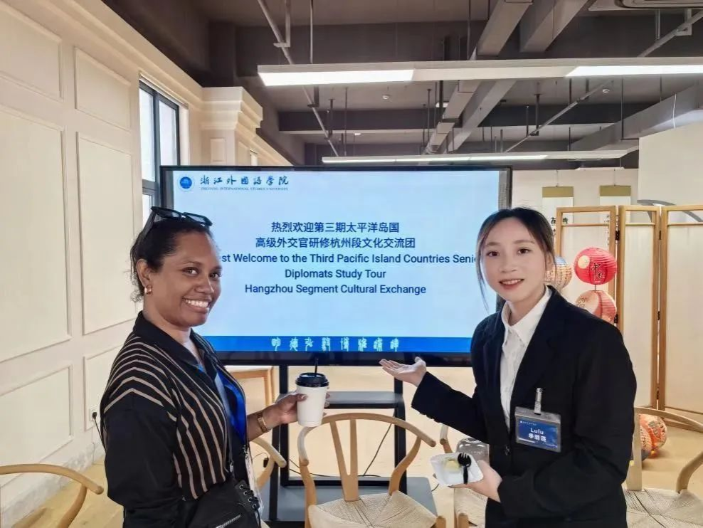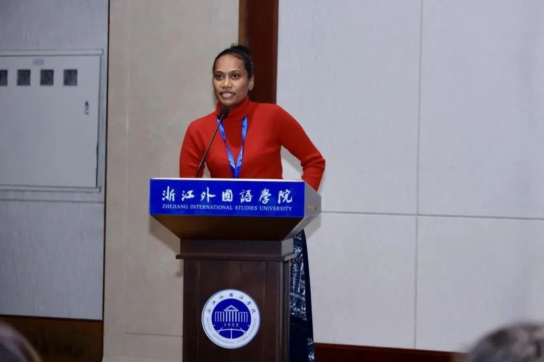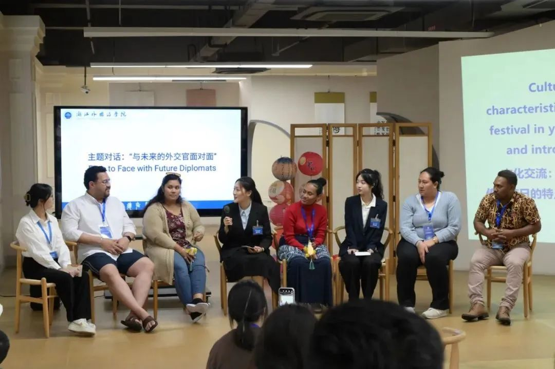 柴改英对远道而来的外交官员们表示热烈欢迎,她介绍了浙外作为浙江省国际人文交流基地与50多个国家和地区的150多所高校保持友好往来的背景。她表示,随着“一带一路”倡议的稳步推进,我国与太平洋岛国的互动与合作日益紧密,文化交流成为双方深入交往的基石。她认为高校既是友谊的受益者,也该成为交流和发展的参与者与助推者,浙外与太平洋岛国之间的交流与友谊,不仅是一段跨越山海的旅程,更是一场互利共赢、共同发展的同向奔赴,期待双方携手并进,共同开创中国与太平洋岛国文化交流的新篇章。