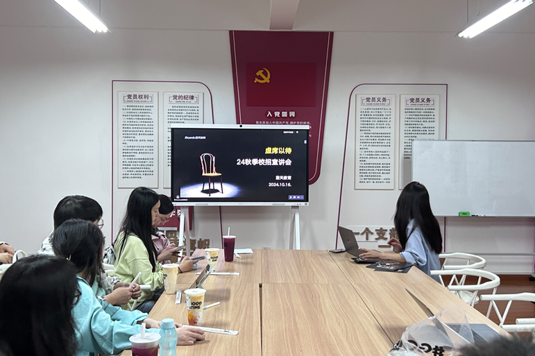 张信紫强调了在当前双减政策的背景下教育的刚性需求,并详细阐述了其同事、家长和员工的特点及差异。随后,她从教育资质、学科优势、历史积淀和地理位置等方面全面展示了蓝天教育的优势。在问答环节,她针对同学们关心的薪资、加班等问题进行了详尽解答,并分享了自己在蓝天教育的成长经历和温馨时刻。