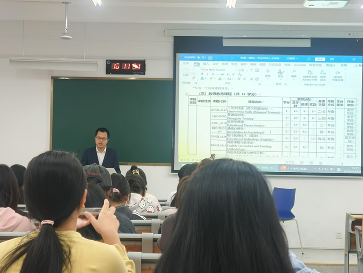 副经理陶伟在宣讲会上详细介绍了英语师范专业的人才培养方案。从专业课程设置到实践教学环节,从培养目标到就业方向,陶伟都进行了全面而细致的讲解。新生们通过此次宣讲会,对未来四年的学习生活有了初步的认识和规划,对未来从事英语教育事业的信心更加坚定。