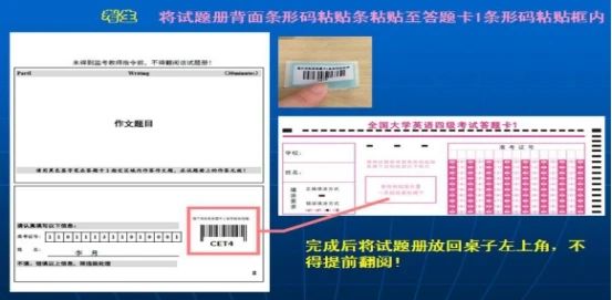 2.▲CET4在9时,CET6在15时,监考员将试题册与答题卡1、答题卡2一同下发后,考生除按要求填写(涂)答题卡1和答题卡2上相关内容外,须将试题册背面上的条形码揭下后粘贴在答题卡1的条形码粘贴框内,并在试题册指定位置填写姓名和准考证号。完成后,考生须将试题册背面向上放回至桌子左上角,不得提前翻阅试题册,违者按违纪处理。