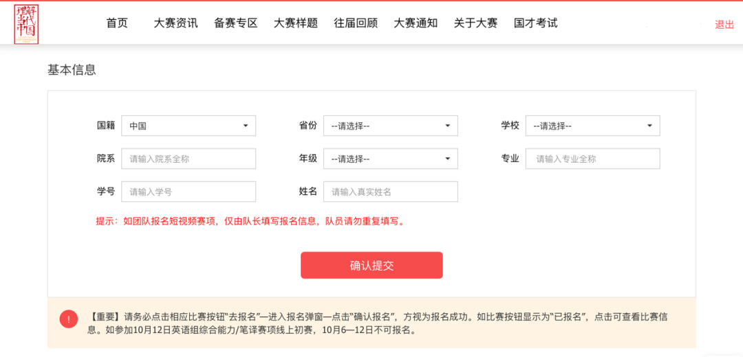 2. 用户注册后填写选手基本信息(需慎重填写,非所有信息都可二次修改)