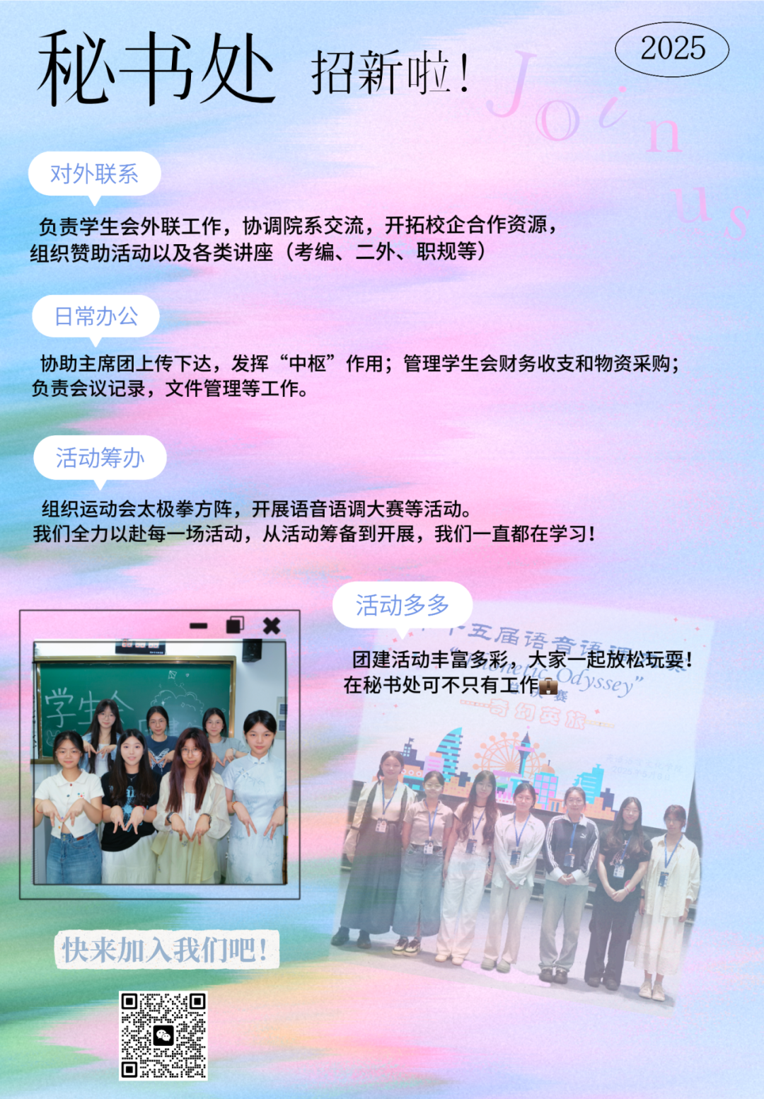 这里,是EMC易倍员工会的中枢地带,是协调与沟通的桥梁。秘书处主要负责联系校内外机构,组织拉取赞助。是员工会日常工作的“靠山石”:处理员工会日常事务,协调各部门关系及协助主席团上传下达、内交外联;负责财务管理、会议记录等重要工作。是你施展才干的“演出台”:筹办各类活动,从策划设计到中控场控,为广大学子提供丰富多彩的校园生活!