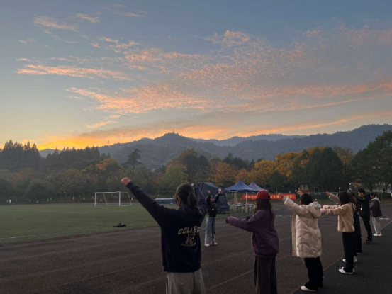 自从加入晨跑队以来,每日晨跑便伴随了我的一整个大一学年。在阳光下跨动脚步,与活力共舞,在一圈圈跑动的坚持之下沉淀内心,向上生长,深耕自己。同时,按时起床按时吃早饭与按时锻炼身体也增强了我的免疫力。晨跑除了对我的身体健康有所增益之外,也使我收获了美的享受。我们从丰收秋际跑入瑟瑟寒冬,也感受了明媚春日与夏树苍翠。去看清晨的薄雾与闻乎亭相交映,清晨的第一束阳光从寻语山上树枝间隙落入大地,初升的太阳渐渐照亮操场草坪上草尖的水汽。透过闪耀晶莹的露珠,里面映射着、记录着晨跑的伙伴们的印记与老师们的守护和鼓励,我们相互追逐,相互激励。